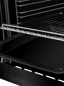 Дверца выполнена из 3-х слойного стекла, которое создает надежную защиту от нагретых элементов духового шкафа, а её полностью стеклянную внутреннюю поверхность очень удобно чистить.