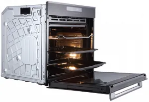 Две лампы подсветки, установленные на боковых стенках, создают тот необходимый поток света, позволяющий увидеть все детали приготовления блюда от цвета корочки до степени прозрачности сока.