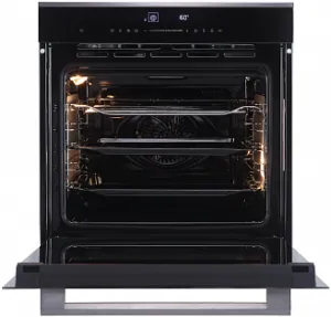 Полноразмерный встраиваемый электрический духовой шкаф черного цвета стандартной шириной 60 см и объемом 72 литра. Выполненный из стекла и металла, он оснащен LED-дисплеем и предлагает удобное сенсорное управление, а также 11 различных режимов работы, включая режимы гриля, размораживания и расстойки теста. Полное выдвижение телескопических направляющих надежно фиксирует противень, обеспечивая безопасность и комфорт в процессе готовки. Встроенный термощуп позволяет точно контролировать температуру внутри блюда. Лампа освещения включается при выборе режима приготовления, а конструкция дверцы с тремя стеклами обеспечивает максимальное удержание тепла внутри камеры, одновременно снижая температуру фронтальной поверхности. Система автоматического охлаждения поддерживает постоянную циркуляцию холодного воздуха, гарантируя низкую температуру боковых стенок и безопасное использование прибора в кухонной мебели. Поверхность боковых стенок покрыта специальным каталитическим веществом, самостоятельно расщепляющим загрязнения при прогреве камеры до определенной температуры. Такая каталитическая очистка значительно упрощает процесс уборки. В комплект с духовым шкафом OKB 1331 GNBX входят глубокий противень, противень для выпечки и хромированная решетка.