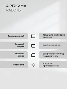 Режимы работы: Традиционный, верхний нагрев, нижний нагрев, подсветка