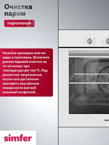 Данный метод очистки позволяет удалять жировые отложения, не используя при этом сильные химические вещества, которые могут повредить внутреннюю поверхность духовки. Устанавливаете режим, наливаете воду, которая медленно испаряясь, смягчает загрязнение и после протираете мягкой тряпкой.