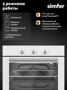 Режимы работы: Верхний + нижний нагрев, Верхний + нижний нагрев + конвекция, Верхний нагрев, Верхний нагрев + конвекция