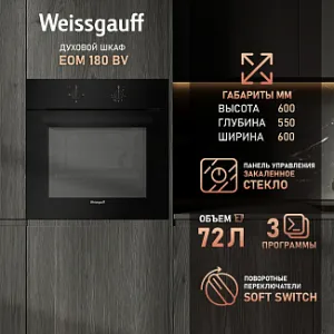 Новое поколение электрических духовых шкафов от Weissgauff предлагает модель, выполненную в чёрном цвете, оснащённый механическими поворотными рукоятками Soft Switch и двойным остеклением дверцы воплощает в себе принцип разумной достаточности, предлагаю пользователю только самые необходимые и нужные режимы по действительно доступной цене! А фантастический увеличенный объем XL 72 литра дополнит совершенство возможностей этого устройства! Благодаря всему этому вы сможете полностью управлять процессом приготовления пищи, добиваясь идеального результата каждый раз! Духовой шкаф Weissgauff станет не только отличным приобретением для вашей кухни, но и настоящим украшением интерьера, отражающим все благородство вашего вкуса и стиля!