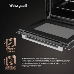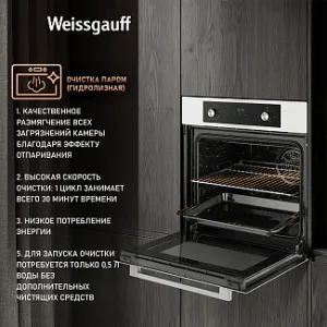 - Гидролизная очистка - особая технология, благодаря который вы раз и навсегда забудете те дни, когда духовой шкаф необходимо было с большим трудом вычищать, вкладывая в это непозволительно много времени и сил. Weissgauff понимает, что в современном мире время является одной из наивысших ценностей - поэтому мы оснастили данную модель функцией гидролиза: всего лишь добавьте небольшое количество воды, и духовой шкаф сам отпарит все загрязнения, используя "эффект сауны", после чего вам останется лишь провести по стенкам мягкой губкой, собрав их и удалив одним движением.