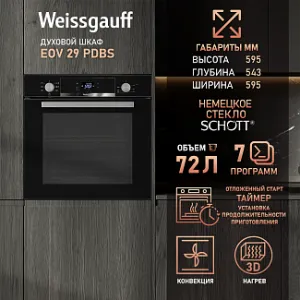 Новое поколение электрических духовых шкафов от Weissgauff предлагает модель, выполненную в черном цвете. Управление, реализованное сочетанием чувствительного сенсорного блока и утапливаемых рукояток PIPO, дополняет богатый функционал, представленный сразу 7 режимами! А фантастический увеличенный объем XL 72 литра дополнит совершенство возможностей этого устройства! Благодаря всему этому вы сможете полностью управлять процессом приготовления пищи, добиваясь идеального результата каждый раз! Духовой шкаф Weissgauff станет не только отличным приобретением для вашей кухни, но и настоящим украшением интерьера, отражающим все благородство вашего вкуса и стиля!