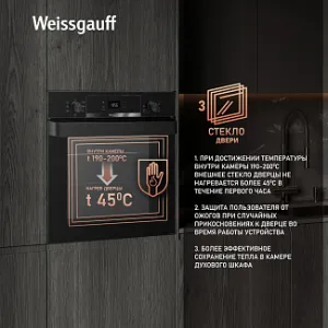 - Тройное стекло дверцы, воплощающее в себе весь подход к безопасности и термозащите, который Weissgauff реализовали в данной модели. Теперь случайные прикосновения к дверце духового шкафа во время процесса приготовления еды больше будут не страшны, ведь мы позаботились о том, чтобы фронтальная сторона духового шкафа никогда не нагревалась до опасных температур.