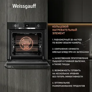 - Кольцевой нагревательный элемент, для равномерного 3D-нагрева, обеспечит по-настоящему качественное и эффективное запекание приготавливаемого блюда благодаря более эффективному распределению тепла в камере духового шкафа.