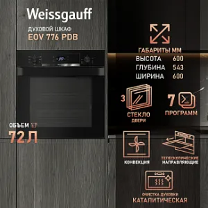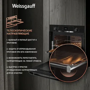 Новое поколение электрических духовых шкафов от Weissgauff предлагает модель, выполненную в черном цвете в дизайне BLACK EDITION. Управление, реализованное сочетанием чувствительного сенсорного блока и утапливаемых черных рукояток PIPO, дополняет богатый функционал, представленный сразу 7 режимами! А фантастический увеличенный объем XL 72 литра дополнит совершенство возможностей этого устройства! Благодаря всему этому вы сможете полностью управлять процессом приготовления пищи, добиваясь идеального результата каждый раз! Духовой шкаф Weissgauff станет не только отличным приобретением для вашей кухни, но и настоящим украшением интерьера, отражающим все благородство вашего вкуса и стиля!