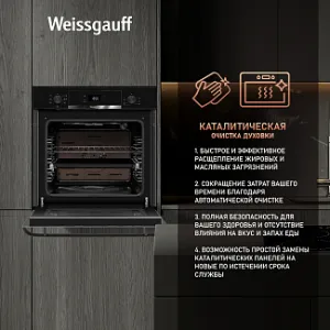 - Каталитическая очистка - особая технология, интегрированная в боковые стенки камеры. Под воздействием высокой температуры, все жировые накопления сами распадаются на воду и углекислый газ при попадании на специальную панель, значительно облегчая процесс очистки духового шкафа!
