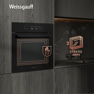 - Тройное стекло дверцы, воплощающее в себе весь подход к безопасности и термозащите, который Weissgauff реализовали в данной модели. Теперь случайные прикосновения к дверце духового шкафа во время процесса приготовления еды больше будут не страшны, ведь мы позаботились о том, чтобы фронтальная сторона духового шкафа никогда не нагревалась до опасных температур.