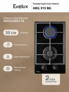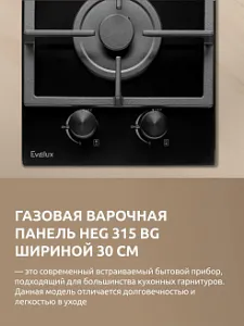 Газовая варочная панель Evelux HEG 315 BG – современная техника для кухни, которая гармонично впишется в любой кухонный интерьер. Эту плиту удобно встроить в рабочий гарнитур благодаря компактной ширине — всего 30 см, что делает прибор подходящим даже для небольших помещений. Варочная поверхность выполнена из прочного закаленного стекла черного цвета, устойчивого к горячему пару, теплу и химическому воздействию, что гарантирует долгий срок службы и легкость ухода.
