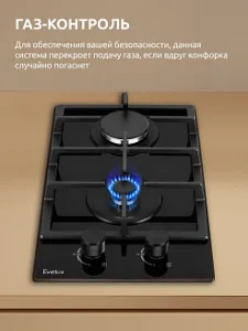 Даже если пламя погаснет, вам не стоит переживать, ведь во всех моделях Evelux установлена система безопасности «Газ-контроль». Данная функция просто остановит подачу газа в случае, если конфорка случайно погаснет.