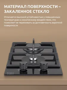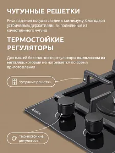 Чугунный материал решетки отличается долговечностью и надежно удерживает посуду во время приготовления еды на газу. Устойчивые держатели сводят к минимуму риск падения посуды с панели, а термостойкие регуляторы выполнены из металла, который не нагревается во время эксплуатации техники.