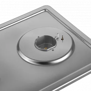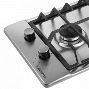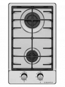 Панель выполнена из нержавеющей стали. В данной модели установлены высококачественные итальянские горелки «Sabaf». Две конфорки разного диаметра с мощностью 1700 Вт и 2600 Вт. Чугунная решетка имеет крестообразные соединения над конфорками, что позволяет готовить в посуде разного диаметра, не используя специальные подставки.