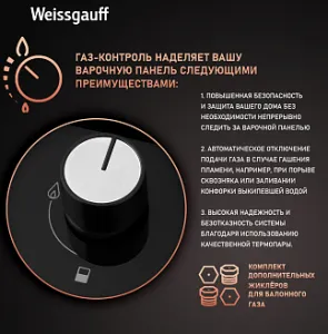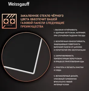 Газовая панель Weissgauff, оснащенная системами "Газ-контроль" и "Автоматический электроподжиг" - это наиболее технологичное решение среди всех моделей коллекции "Домино", в дизайне "газ на чёрном стекле".
