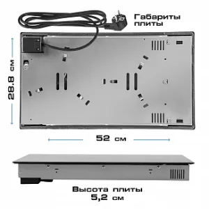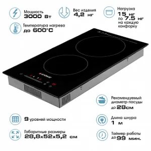Особенности и дополнительные функции 9 уровней мощности, Сенсорное управление, Стеклокерамическая рабочая поверхность повышенной прочности, Таймер работы 99 минут, Функция защиты от скачков напряжения в сети, Функция защиты от перегрева, Функция блокировки, Функция автоотключения, Рекомендуемый диаметр посуды до 28 см, Допустимая нагрузка на поверхность 15 кг (по 7,5 кг на каждую конфорку)