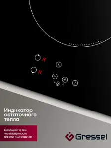 Световой индикатор в варочных поверхностях Gressel горит, пока температура соответствующего нагревательного поля не понизится до 60 С. Это можно также использовать для подогрева блюд при уже выключенной плите, что позволяет экономить электроэнергию.