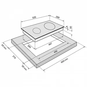 Диаметр и мощность конфорок, мм/кВт: Дальняя: 200 мм * 1,8 кВт; Ближняя: 165 мм * 1,2 кВт