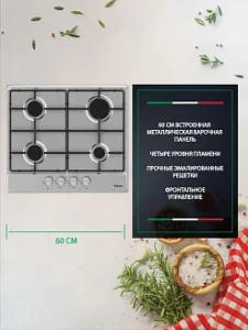 Мощность каждой конфорки: 0.95 кВт (передняя правая), 1.7 кВт (задняя левая), 1.7 кВт (передняя левая), 2.9 кВт (задняя правая)