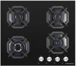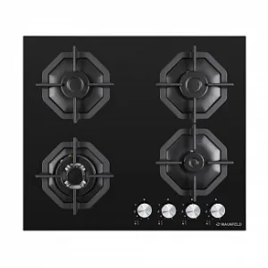 4 газовые итальянские конфорки: 3000, 1700, 1700, 1000 Вт. Фронтальное управление, 4 поворотных переключателя, автоматический электроподжиг под ручкой управления, возможность работы от магистрального газа и газа в балоне (тип G30).