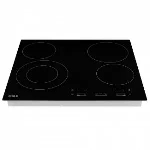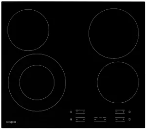 Варочная электрическая поверхность польского бренда AKPO (АКПО) из стеклокерамики с сенсорным индивидуальным управлением для каждой конфорки, 9 уровнями мощности и инфракрасным нагревом, функциями «Booster», «Сохранение тепла», а также защитным отключением конфорок и распознаванием посуды.