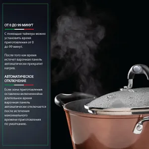 - ОТ 0 ДО 99 МИНУТ. С помощью таймера можно установить время приготовления от 0 до 99 минут. После того как время истечет, варочная панель автоматически прекратит нагрев.