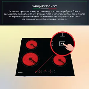 - ФУНКЦИЯ "СТОП И GO". Это может привести к тому, что ужин подгорит или потребуется больше времени если вы выключите все. Функция "Стоп и о отключает все зоны, а когда вы вернетесь одним нажатием кнопки они снова запустятся с того места где остановились чтобы продолжить готовку.