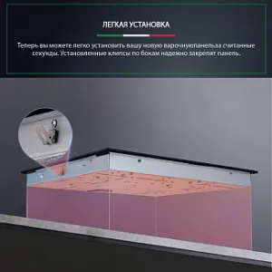 - ЛЕГКАЯ УСТАНОВКА. Теперь вы можете легко установить вашу новую варочную панель за считанные секунды. Установленные клипсы по бокам надежно закрепят панель.