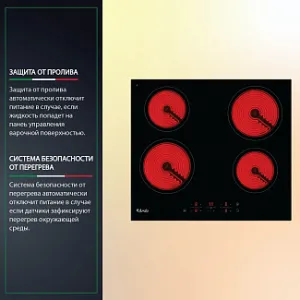- ЗАЩИТА ОТ ПРОЛИВА. Защита от пролива автоматически отключит питание в случае, если жидкость попадет на панеьуправления варочной поверхностью.