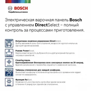 Зоны нагрева Bosch оборудованы современными нагревательными элементами Hilight, которые отличаются высокой скоростью нагрева, энергоэффективностью и надежностью.