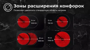 Овальной зоны расширения открывает дополнительные удобства в приготовлении на варочной панели и делает зону нагрева универсальной: в обычном режиме она подходит для кухонной посуды с маленьким или средним дном, а при активации овальной зоны расширения можно использовать посуду нестандартной формы например: гусятницу, сковороду для гриля, блинницу и большую нестандартную посуду, так же позволит приготовить рыбу целиком.