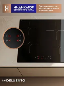 Световой индикатор в варочных поверхностях Delvento горит, пока температура соответствующего нагревательного поля не понизится до 60 С. Это можно также использовать для подогрева блюд при уже выключенной плите, что позволяет экономить электроэнергию.
