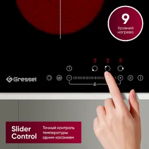 Современное управление Slider control обеспечивает легкость и точность в регулировке температуры с 9 уровнями нагрева. Встроенный таймер до 99 минут позволяет точно контролировать время приготовления и автоматически отключает конфорку по его истечении, издавая при этом звуковой сигнал.