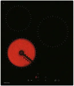 Диаметр и мощность конфорок, мм/кВт Дальняя левая: 165 мм * 1,2 кВт; Ближняя левая: 200 мм * 1,8 кВт; Центральная правая: 200 мм * 1,8 кВт