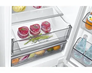 Зона свежести (Fresh Zone) представляет собой выдвижной ящик, в котором создаются две температурные зоны. Левая сторона может быть холоднее, тем самым создаются лучшие условия для мяса и рыбы. Правая сторона великолепно подходит для хранения овощей и фруктов.