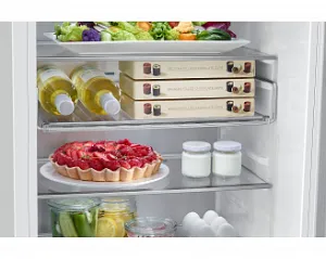 Улучшенное использование пространства холодильника с функциональной винной полкой. Продуманный дизайн с широкой выемкой позволяет хранить даже бутылки из-под шампанского, а плоская форма полок может быть использована для хранения других продуктов, например, коробок для яиц.