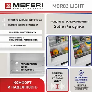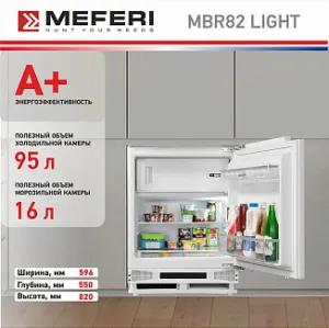 - Встраиваемый холодильник MEFERI MBR82 LOW FROST LIGHT — это надежный помощник на небольшой кухне дома или в офисе, который обеспечит эффективное хранение ваших продуктов, сохраняя их свежесть и качество.