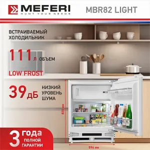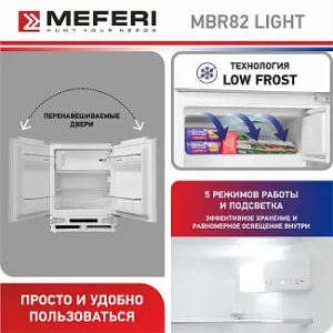 - Встраиваемый холодильник MEFERI MBR82 LOW FROST LIGHT сочетает в себе компактные размеры и многофункциональное внутреннее пространство: с 2 полками в холодильной камере, 2 ящиками для овощей, морозильной камерой и 2 полками на двери вы можете организовать хранение продуктов в небольшом, но вместительном объеме холодильника.