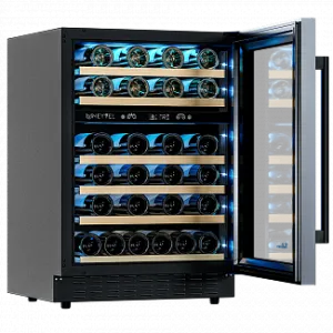 Компрессорный винный шкаф Meyvel MV46PRO-KBT2 обладает большой вместимостью и даёт возможность разместить до 46 бутылок стандартного типа Бордо (0,75 л). Располагаются они на выкатных полках из дерева. Внутреннее пространство шкафа разделено на 2 температурные зоны, с возможностью настраиваить каждую из них. Диапазон верхней зоны варьируется от +5°C до +12°C, а нижней - от +12°C до +20°C.