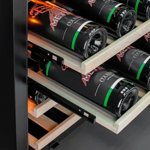 Компрессорный винный шкаф Meyvel MV46PRO-KWT2 обладает большой вместимостью и даёт возможность разместить до 46 бутылок стандартного типа Бордо (0,75 л). Располагаются они на выкатных полках из дерева. Внутреннее пространство шкафа разделено на 2 температурные зоны, с возможностью настраивать каждую из них. Диапазон верхней зоны варьируется от +5°C до +12°C, а нижней - от +12°C до +20°C.