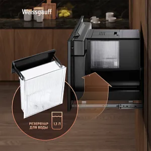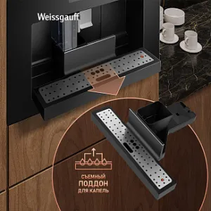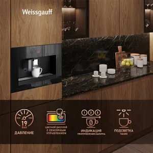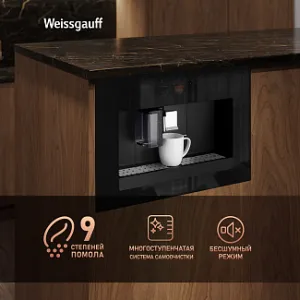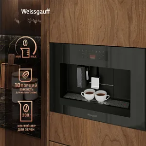 Встраиваемая кофемашина от Weissgauff, выполненная в черном цвете, оснащенная вместительным контейнером для зерен на 200 граммов и емкостью для молотого кофе на 10 порций, обладающая цветным сенсорным дисплеем, системой подачи молока с капучинатором, внешней емкостью для молока, а также 16 заранее предустановленными программами для приготовления ароматного вкуснейшего кофе и напитков прямо на вашей кухне!
