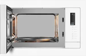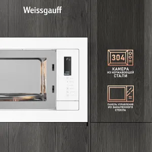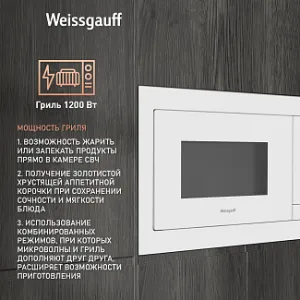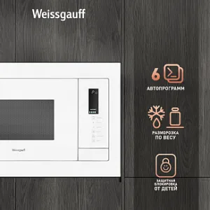 Встраиваемая микроволновая печь Weissgauff с объемом 25 литров, выполненная в белом цвете, равномерно разогревает еду при помощи поворотного стола, а также оснащена грилем с возможностью работы в комбинированном режиме и набором программ автоменю!