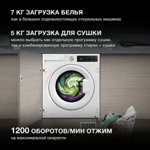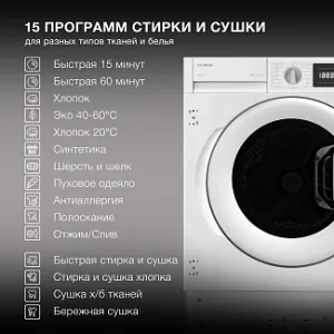 Программы (полное описание): ECO 40-60, Хлопок, Хлопок 20°C, Синтетика, Шерсть и шелк, Пуховое одеяло, Антиаллергия, Полоскание, Отжим/Слив, Быстрая стирка 15 мин, Быстрая стирка 60 мин, Стирка и сушка хлопка, Быстрая стирка и сушка, Сушка х/б тканей, Бережная сушка