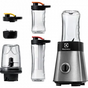 - В упаковке: бутылка емкостью 600 мл с охлаждающей палочкой и крышкой с ручкой, 2 бутылки емкостью по 300 мл с крышкой с ручкой, измельчитель, кофемолка.