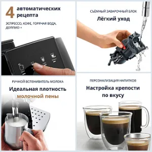 Вы можете наслаждаться как молотым кофе, так и кофе в зернах и открывать свои любимые композиции. Достаточно нажать одну кнопку и через несколько мгновений вы сможете насладиться прекрасным вкусом и ароматом. Вы также можете определить собственные предпочтения — размер, интенсивность и температуру, а затем сохранить их в памяти машины, чтобы быстро приготовить любимый кофе.