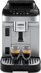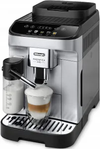 Дебютировавшая летом 2022 года кофемашина производства De'Longhi — это одно из старших решений фирменной линейки Magnifica. Ключевым отличием на фоне младших моделей, например модели ECAM 290.31.SB, является наличие автоматического капучинатора LatteCrema. Он без участия пользователя создаст стойкую и густую пенку для приготовления кофейно-молочных напитков. Комплектный резервуар для молока легко снимается, а его очистка допускается в посудомоечной машине. Кофемашина De'Longhi Magnifica Evo ECAM 290.61.SB получила информативную сенсорную панель управления с возможностью запуска одного из пяти предложенных рецептов в одно нажатие. Это четверка самых ходовых кофейных напитков — эспрессо, американо, латте и капучино, а также горячая вода (например, для заваривания чая). Также с помощью сенсоров можно настроить крепость кофе (три степени), объем напитка, запустить сервисные режимы (самоочистка). Для приготовления можно использовать уже молотый кофе или зерна. Предусмотренная тут кофемолка вмещает 250 грамм и позволяет регулировать степень помола. Заварочный блок здесь легко снимается, что упрощает его очистку. Применяется проверенная помпа на 15 бар и термоблок на 1450 Вт. Первая поможет раскрыть кофейный аромат, а второй — не заставит долго ждать нагрева и приготовления напитков.