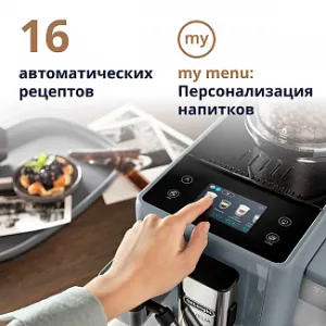 Интуитивно понятный цветной дисплей с диагональю 3,5 дюйма обеспечивает удобное управление всеми функциями кофемашины. Вы можете выбрать из 16 различных напитков всего лишь одним касанием.