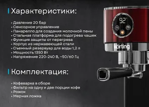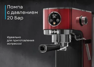 Кофеварка KCM 1004 ER, которая выполнена в благородном темно-красном цвете, отличается компактными размерами. При ширине всего 13 см она скрывает мощную помпу с давлением 20 бар. Это устройство предназначено для приготовления традиционных кофейных напитков, таких как латте, капучино и эспрессо. Интуитивно понятный цветной сенсорный экран позволяет легко выбирать напитки и настраивать размеры порций одним касанием. Встроенная платформа для подогрева чашек способствует лучшему раскрытию вкуса и аромата кофе за счет поддержания оптимальной температуры напитка. Кофеварка укомплектована металлическим рожком с двумя фильтрами для приготовления одной или двух чашек и насадкой-капучинатором для создания густой и стойкой молочной пены. В комплект также входят мерная ложка и уплотнитель для кофе. Стабильное положение на поверхности обеспечивают противоскользящие ножки, а съемный поддон позволяет, при необходимости, использовать более крупные чашки.