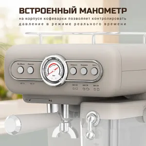 В качестве системы нагрева используется компактный, безопасный и энергоэффективный термоблок, который моментально нагревает воду до нужной температуры. Встроенный манометр на корпусе кофеварки позволяет контролировать давление в режиме реального времени.
