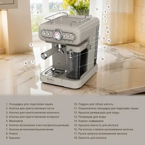 Мощность кофеварки составляет 950 Вт, а давление достигает 19 бар, что гарантирует насыщенный вкус каждой приготовленной чашки. Итальянская помпа ULKA обеспечивает стабильное и точное давление воды, что важно для правильного экстрагирования кофе и получения качественного напитка.